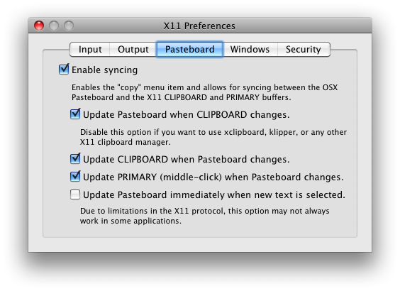 Or would 'Enable Syncing' selected, with everything else deselected allow what I desire - the ability to run an external pbproxy equivalent? As to the 'Update Pasteboard when CLIPBOARD changes' option. As written this seems to imply that pbproxy will always act as a CLIPBOARD manager and take ownership of the CLIPBOARD selection after it has been changed. However I believe it should be possible to seperate the CLIPBOARD->Pasteboard proxying from pbproxy acting as a CLIPBOARD manager. I'm not sure if we need an option to disable updating PRIMARY when Pasteboard changes. Does anyone want this facility? All X apps will (I believe) acquire PRIMARY when they acquire CLIPBOARD, and so this would always be enabled. So I suspect these two should be combined in to a single 'Update PRIMARY and CLIPBOARD when Pasteboard changes' option.