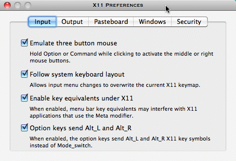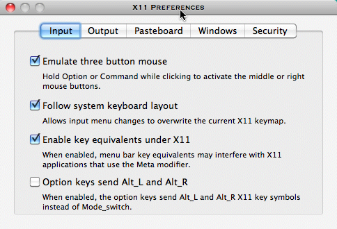 This overriding should then produce the same effect in both servers, because ~/.Xmodmap has since years: clear Mod1 keycode 66 = Mode_switch In XQuartz 2.7.2_rc2 I have to *activate* "Option keys send Alt_L and Alt_R" in order to have Alt-7 (Shift-7 is / on my German keyboard) produce | (and to have Alt-Shift-7 produce \). In XQuartz 2.7.2 from MacPorts I have to *deactivate* "Option keys send Alt_L and Alt_R" in order to have Alt-7 produce | (and to have Alt-Shift-7 produce \). I need to have contradicting settings with both identical documentation/explanation to have the same effect. Something must be wrong – and I presume my Mac is a piece of hardware and not something living. Which would explain the effect. -- Greetings Pete Encryption, n.: A powerful algorithmic encoding technique employed in the creation of computer manuals.